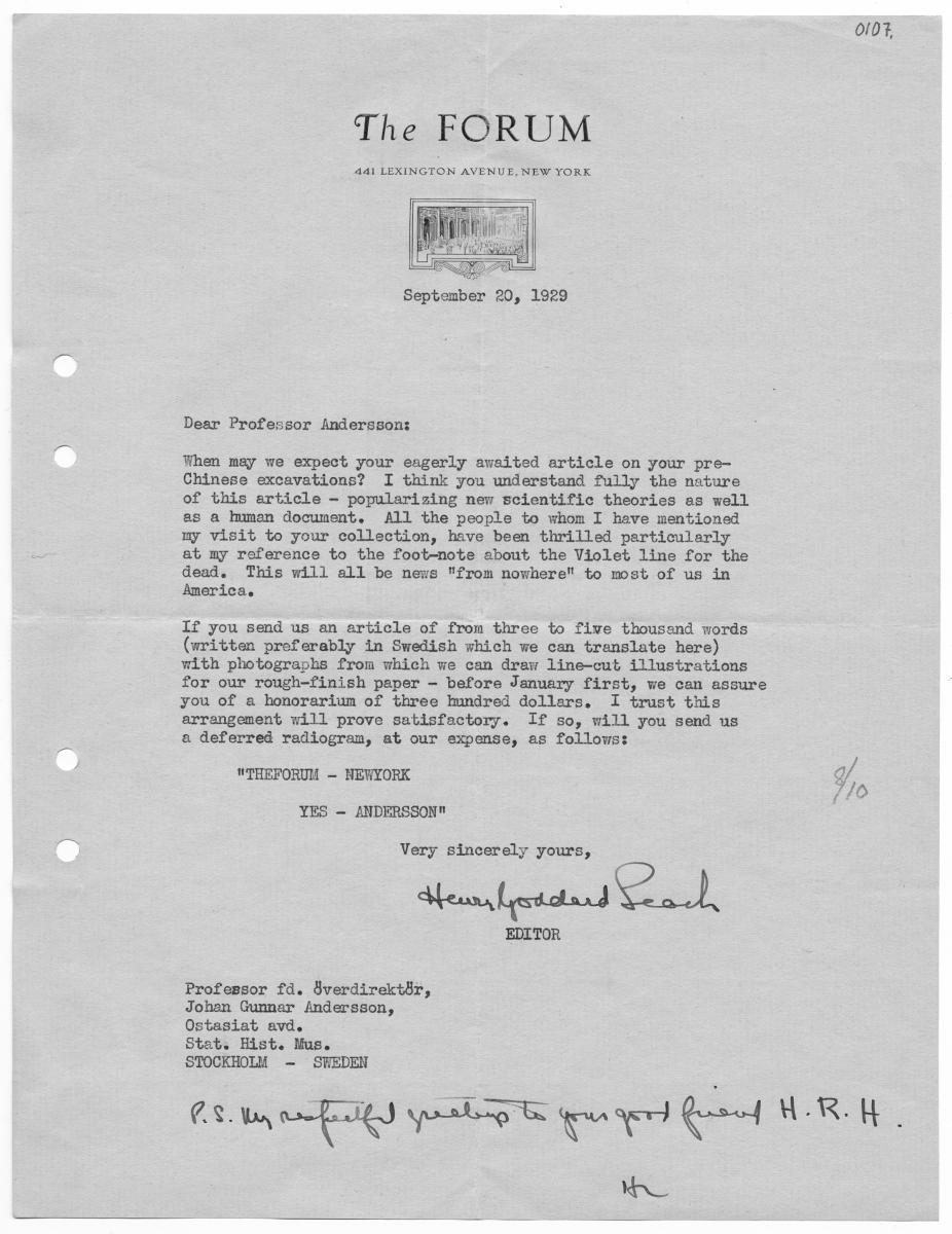 OIDT, The FORUM 441 LEXINGTON AVENUE, NEW YORK ST September 20, 1929 Dear Professor Andersson: When may we expect your eagerly awaited article on your pre- Chinese excavations? I think you understand fully the nature of This article - popularizing new scientific theories as well as a human document. All the people to whom I have mentioned ny visit to your collection, have been thrilled particularl...