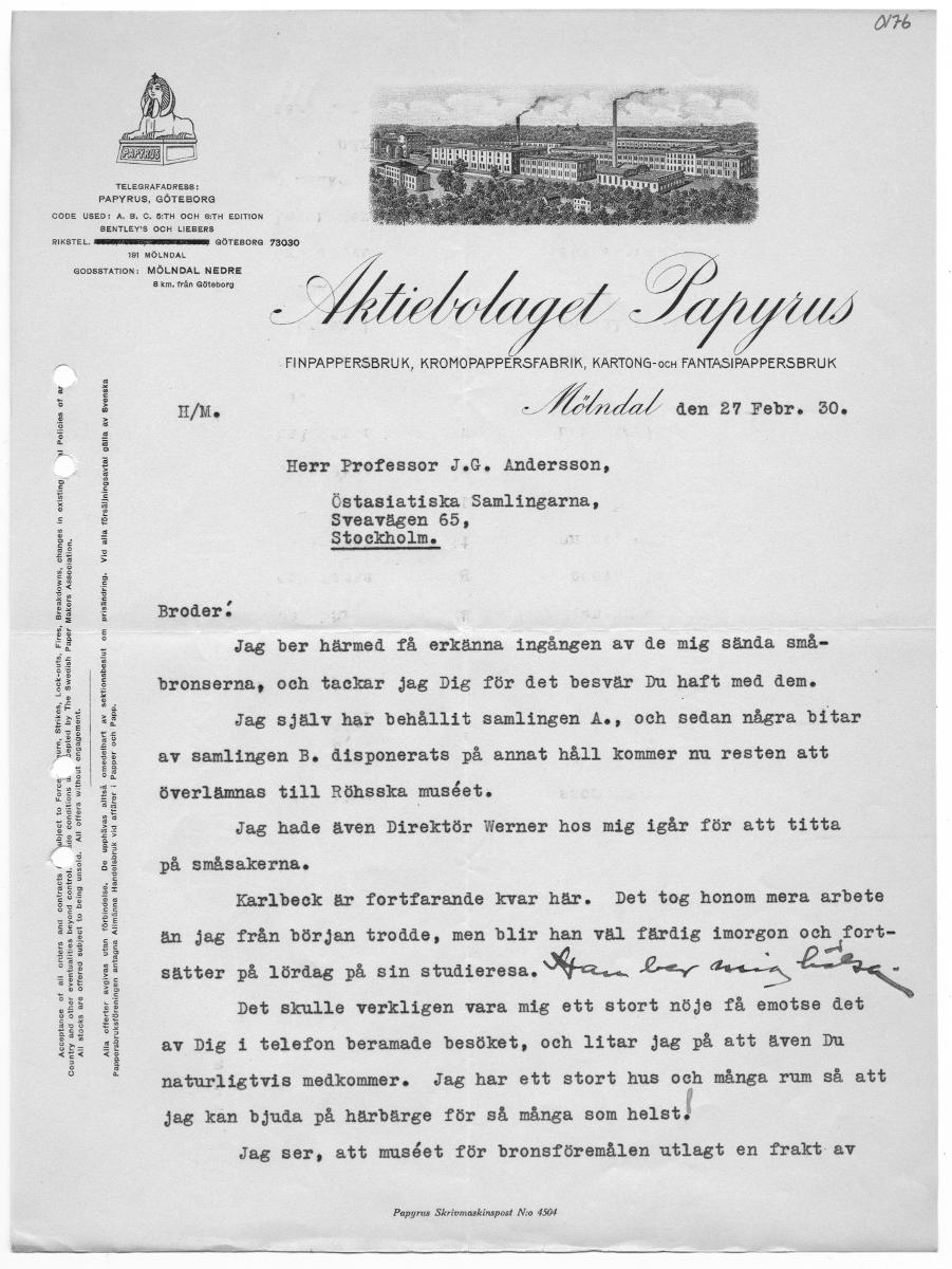 0/76 TELEGRAFADRESS: PAPYRUS, GÖTEBORG CODE USED: A. B, C. 5&:TH OCH 6:TH EDITION BENTLEY'S OCH LIEBERS RIKSTEL. SöTEEAUNUSruNSTSETNSNNN GÖTEBORG 73030 191 MÖLNDAL GODSSTATION: MÖLNDAL NEDRE 8 km. från Göteborg fidelagad ; Iafryrus FINPAPPERSBRUK, KROMOPAPPERSFABRIK, KARTONG-ocH FANTASIPAPPERSBRUK H/M. Krka den 27 Febr. 30. Herr Professor J.G.,. Andersson, ) MH Policies of ar Östasiatiska Samlingarna, Sveavägen 65, Stockholm. Broder: ; Jag ber härmed få erkänna ingången av de mig sända små- bronserna, och tackar jag Dig för det besvär Du haft med dem. Jag själv har behållit samlingen A., och sedan några bitar re, Strikes, Lock-outs, Fires, Breakdowns, changes in existing epted by The Swedish Paper Makers Association. u hout engagement. Å av samlingen B. disponerats på annat håll kommer nu resten att IT överlämnas till Röhsska muséet. gr Jag hade även Direktör Werner hos mig igår för att titta 25 De upphävas alltså omedelbart av sektionsbeslut om prisändring. Vid alla försäljningsavtal gälla av Svenska Pappersbruksföreningen antagna Allmänna Handelsbruk vid affärer i Papper och Papp. på småsakerna. Karlbeck är fortfarande kvar här. Det tog honom mera arbete än jag från början trodde, men blir han väl färdig imorgon och ERE sätter på lördag på sin RR SA Ley ggn ee. Det skulle verkligen vara mig ett stort nöje få emotse det All stocks are offered subject to being unsold. All offers witl Acceptance of all orders and contracts / Country and other eventualities beyond control. Alla offerter avgivas utan förbindelse. av Dig i telefon beramade besöket, och litar jag på att även Du naturligtvis medkommer. Jag har ett stort hus och många rum så att jag kan bjuda på härbärge för så många som beter) Jag ser, att muséet för bronsföremålen utlagt en frakt av Papyrus Skrivmaskinspost N:o 4504