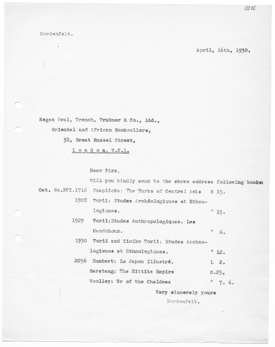 O275. Nordenfelt. April, léth, 1930. Kegan Paul, Trench, Trubner & Co., Ltå., Oriental ané African Booksellers, 38, Great Russel Street, L ond om, WF.C.l, Deer Sirs, Will you kindly send to the ebove address following books: Cat. No.XVI.1716 Czeaplicka: The Turks of Central Asia SS 153 1928 Torii: Etudes Archéologiques et Ethno- logiaques. "” 25; 1929 Toril:Etudes Anthropologiques. Les Mandehoux. "8 1930 Torii and Kimiko Torii; Etudes Archeo- logiwues et Ethnologiques. AG 2056 Humbert: Le Jepon Illustré. LL 2; Garstang: The Hittite Empire S.25, Woolley: Ur of the Chaldees NE Very sincerely yours Nordenfelt.