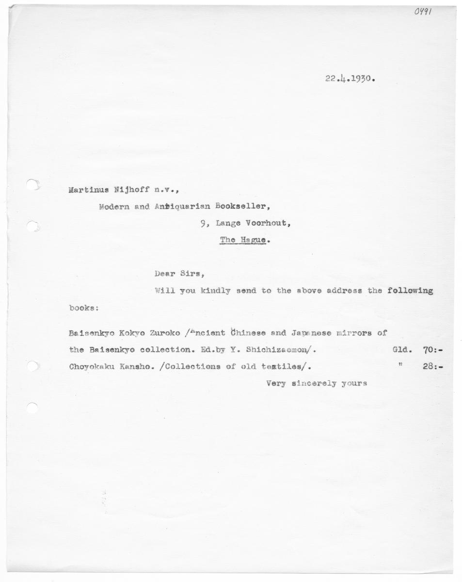 • 0791 22.11.1930. Martinus Nijhoff n.v., Modern and Anbiouarian Bookseller, 9, Lange Voorhout, Ine Hague. Dear Sirs, Will you kindly send to the above address the following books: Beaisenkyo Kokyvo Zuroko /fneient Öhinese and Japanese mirrors of the Baisenkyo collection. Ed.by Y. Shichizaemon/. Glå. 70:- Chovokaku Kansho. /Collecetions of old tertiles/. $ 28:- Very sincerely yours