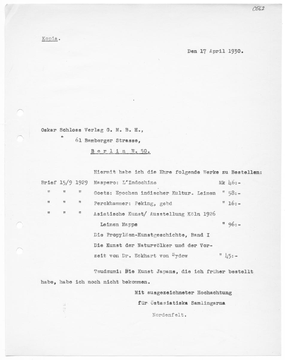 • 0562 Kopia. Den 17 £pril 1930. Oskar Schloss Verleg G. M. B. H., 61 Bamberger Strasse, Berlin W. 50, Hiermit hebe ich die Ehre folgende Werke zu Bestellen: Brief 15/9 1929 HMaspero: L'Indochine Mk 6: Sr c Goetz: Epochen indischer Kultur. Leinen " 58:- ” - g Perckhammer: Peking, gebd " 16:- ör id Asiatische Kunst/ tusstellung Köln 1926 Leinen Meppe " 96:- Die Propylöen-Kunstgsesechichte, Band I Die... Visa hela