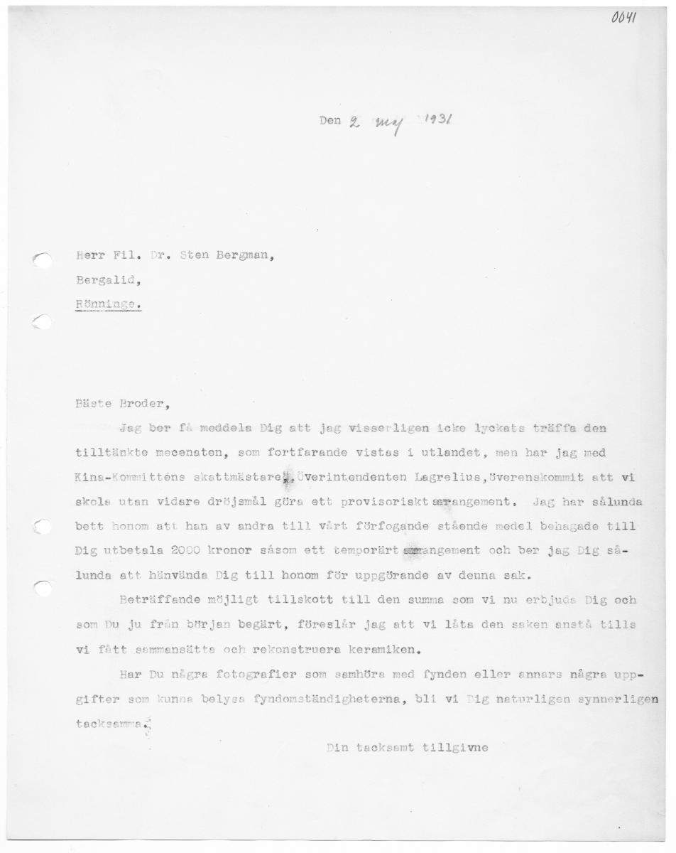 O6Y Den 2 me 193/ Herr Fil. Dr. Sten Bergman, Bergalid, Rönninge. Bäste Broder, Jag ber få medåela Dig att jag visserligen icke lyeckate träffa den tilltänkte mecenaten, som fortferande vistas i utlandet, men har jag med Kine-Kommitténse skattmästareg, verintendenten Lagrelius,överenskommit att wvi skole utan vidare dröjsmål göra ett provisoriskt emangement., Jag har sålunda bett honom att han av andra till vårt förfogande stående medel behagade till Dig utbetala 2000 kronor såsom ett temporärt grangement och ber jag Dig så- lunda att hänvända Dig till honom för uppgörande av denna sek. Beträffende möjligt tillskott till den summa som vi nu erbjuca Dlg och som Du ju från början begärt, föreslår jag att vi låta den saken anstå tills vi fått semmensätte och rekonstruera keramiken, Har Du nigra fotografier som semhöra med fynden eller ennars några upp- gifter som kunna belyss fyndomständigheterna, bli vi Dig naturligen synnerligen tacksamma s Din tecksemt tillgivne