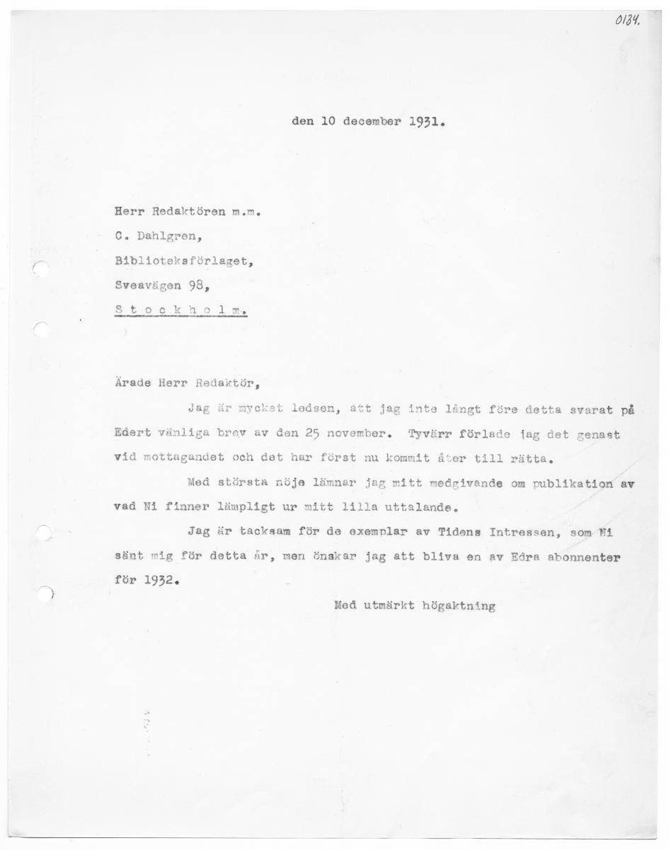 • 0134 / den 10 december 1931. / Herr Redaktören m.m. / C. Dahlgren, / Biblioteksförlaget, / Sveavägen 98, / Stockholm. / Ärade Herr Redaktör, / Jag är mycket ledsen, att jag inte långt före detta svarat på Edert vänliga brev av den 25 november. Tyvärr förlade jag det genast vid mottagandet och det har först nu kommit åter till rätta. / Med största nöje lämnar jag mitt medgivande om publikation av v... Visa hela