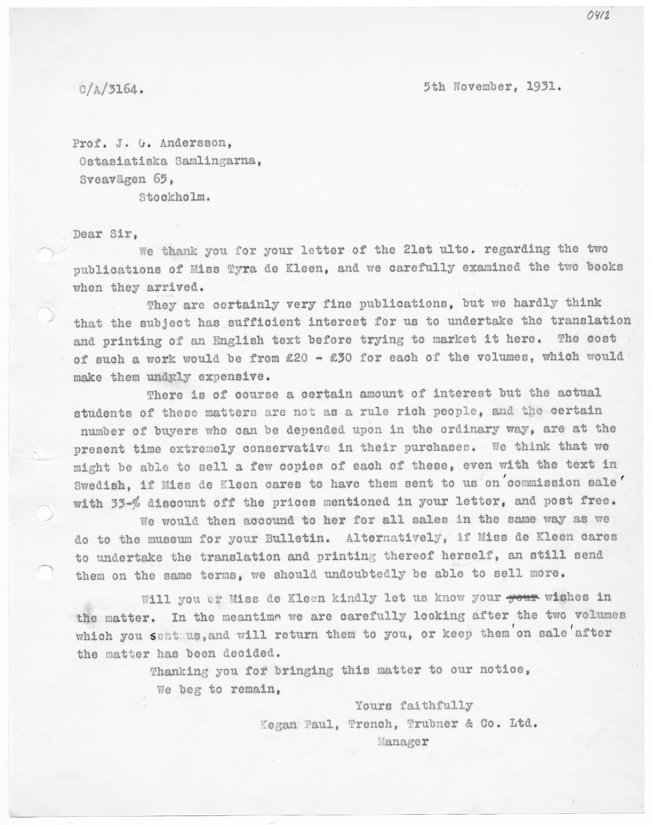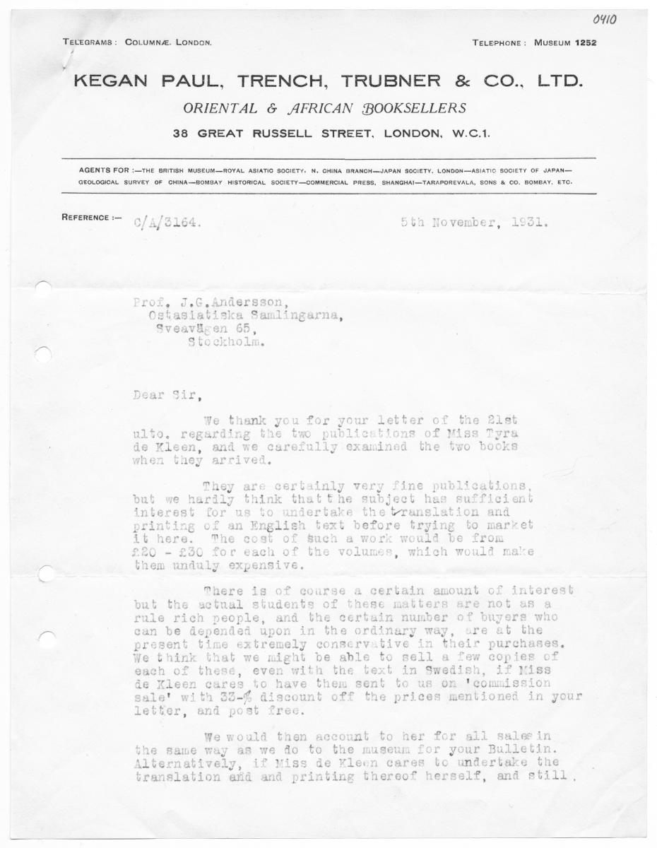 omm "0/K/3164. 5th November, 1931. Prof. J. G. Andersson, Ostasiatiska Samlingarna, Sveavägen 65, Stockholm. Dear Sir, 5 We thank you for your letter of the 21st ulto. regarding the two publications of Miss Tyra de Kleen, and we carefully examined the two books when they arrived. They are certainly very fine publications, but we haräly think that the subject has sufficient interest for us to under...