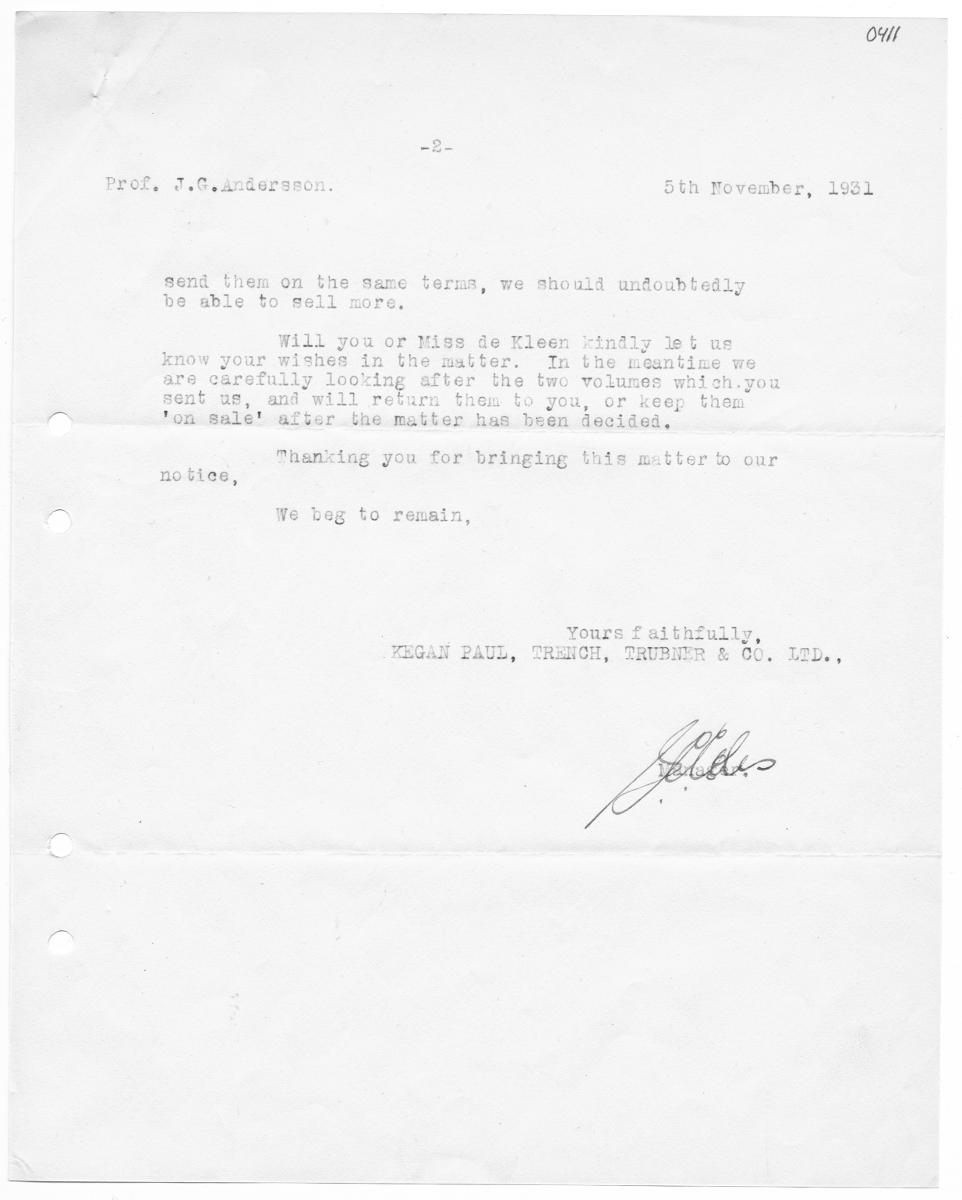 omm "0/K/3164. 5th November, 1931. Prof. J. G. Andersson, Ostasiatiska Samlingarna, Sveavägen 65, Stockholm. Dear Sir, 5 We thank you for your letter of the 21st ulto. regarding the two publications of Miss Tyra de Kleen, and we carefully examined the two books when they arrived. They are certainly very fine publications, but we haräly think that the subject has sufficient interest for us to undertake the translation and printing of an English text before trying to market it here. The cost of such a work would be from £20 = £30 for each of the volumes, which would make them undyly expensive: There is of course a certain amount of interest but the actual students of these mattörs are not as a rule rich people, and the certain number of buyers who can be depended upon in the ordinary way, are at the present time extremely conservative in their purchases. We think that we might be able to sell a few copier of each of these, even with the text in Swedish, if Mies de Kleen cares to have them sent to us on 'commission sale” with 33-94 discount off the prices mentioned in your letter, and post free. We would then accound to her for all sales in the same way as we do to the museum for your Bulletin. Alternatively, if Miss de Kleen Cares to undertake the translation and printing thereof herself, an still send them on the same terms, we should undoubtedly be able to sell more. Will you of Miss de Kleen kindly let us know your sew wighes in tie matter. In the meantime we are carefully looking after She two volumes which you sentous,and will return them to you, or keep them on sale'after the matter has been decided. Thanking you fof bringing this matter to our notice, Ve beg to remain, Yours faithfully Kegan Paul, Trench, Trubner & Co. Ltåä. Manager