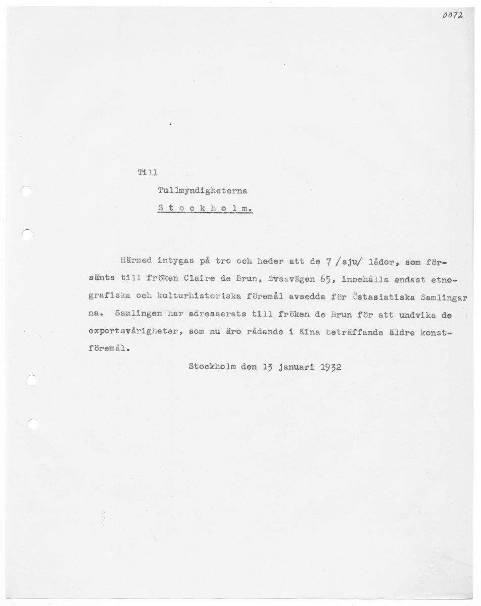BOR, TLL Tullmyndigheterna st ock io im Härmed intygas på tro och heder att de 7 /sju/ lådor, som för- sänts till fröken Cleire de Brun, Sveavägen 65, innehålla endast etno- grafiska och kulturhistoriska föremål avsedda för Östasiatiska Samlingar na. Semlingen har adresserats till fröken de Brun för att undvika de exportsvårigheter, som nu äro rådande i Kina beträffande äldre konst- föremål. Stockholm den 13 januari 1932