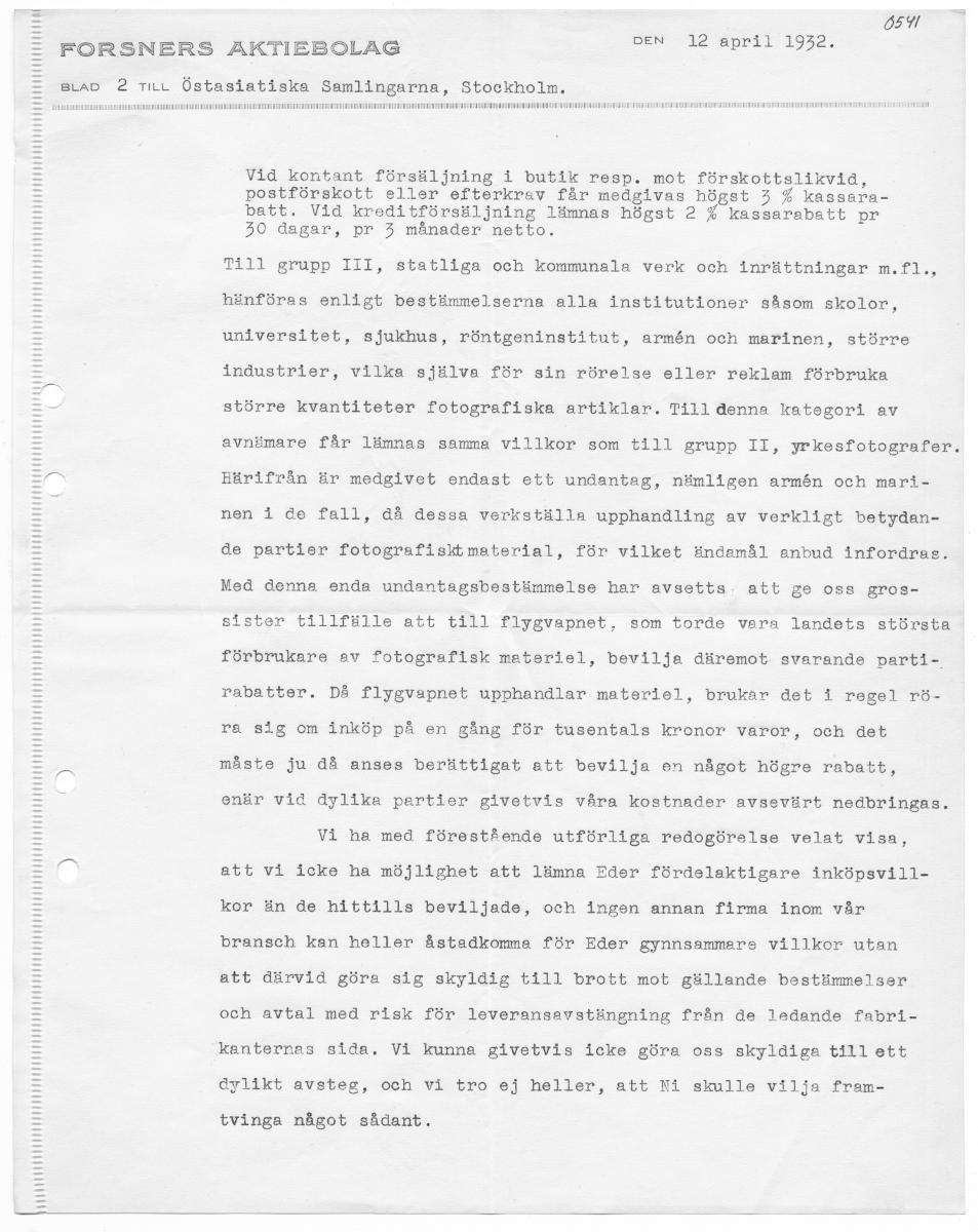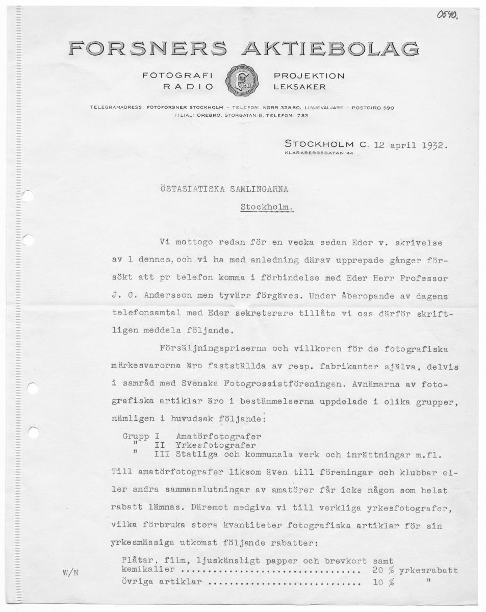 W/N MN KRKUKEN FOTOGRAFI RADIO PROJEKTION LEKSAKER TELEGRAMADRESS: FOTOFORSNER STOCKHOLM - TELEFON: NORR 32580, LINJEVÄLJARE - POSTGIRO 590 FILIAL: ÖREBRO, STORGATAN 8, TELEFON: 783 STOCKHOLM C. 12-appil 1932; KLARABERGSGATAN 44 . ÖSTASIATISKA SAMLINGARNA Stockholm. Vi mottogo redan för en vecka sedan Eder v. skrivelse av 1 dennes, och vi ha med anledning därav upprepade gånger för- sökt att pr telefon komma i förbindelse med Eder Herr Professor J. GC. Andersson men tyvärr förgäves. Under åberopande av dagens telefonsamtal med Eder sekreterare tillåta vi oss därför skrift- ligen meddela följande. Försäljningspriserna och villkoren för de fotografiska märkesvarorna äro fastställda av resp. fabrikanter själva, delvis i samråd med Svenska Fotogrossistföreningen. Avnämarna av foto- grafiska artiklar äro i bestämmelserna uppdelade i olika grupper, nämligen i huvudsak följande: Grupp & Amatörfotografer II Yrkesfotografer ITI Statliga och kommunala verk och inrättningar m.fl. "| Till amatörfotografer liksom även till föreningar och klubbar el- ler andra sammanslutningar av amatörer får icke någon som helst rabatt lämnas. Däremot medgiva vi till verkliga yrkesfotografer, vilka förbruka stora kvantiteter fotografiska artiklar för sin yrkesmässiga utkomst följande rabatter: Plåtar, film, ljuskänsligt papper och brevkort samt kemikalier se02€e0o07€ or 9 or 0 oo 2 CO 2 yrkesrabatt ÖVPISA BICLEIEP: NG + sorkar serna 0 oa