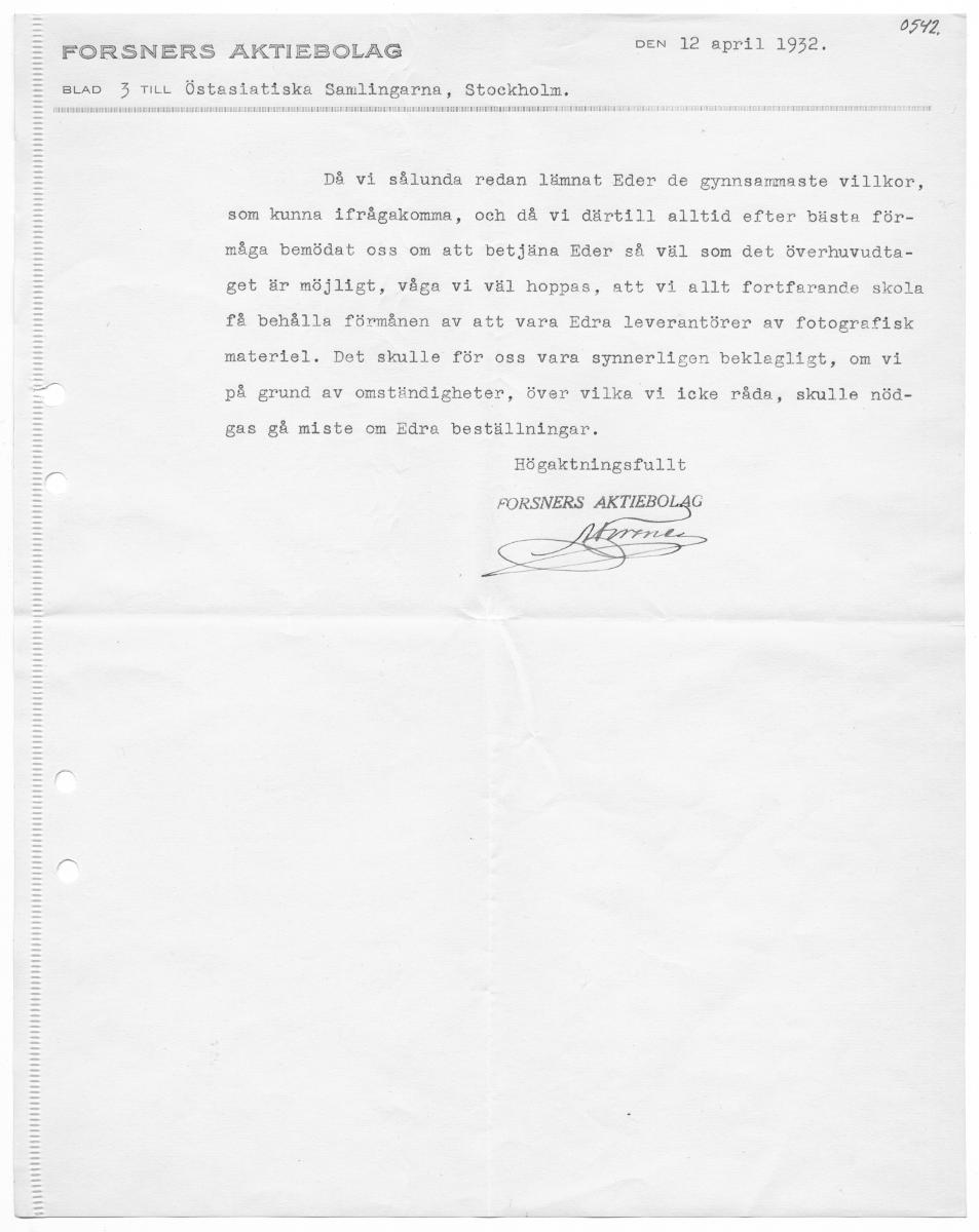 BARR RR RR RR RR RR RR RR RR RR RR RR RR aAa RR a a a a a RE RA HA VA TA 0572 FOÖRSNERS AKTIEBOLAG DEN 12 april 1932. BLAD 3 TILL Östasiatiska Samlingarna, Stockholm. SRORORRDEDERAARRNANEAURRA FAROR DATOR EAA RDRAERDADRERERNANEREAFANEA BA NRNR RAD ADA DBNEREA DRA ARA SNRAEKRAA ARA RGE RADDA bARAEDRNDADASERHEENOENEREDRAKEREARAEDADADRRAEDEDNAFEROUENSNOSRURAEREARUDDARADN ERNA ERABAADESKARDAEDRNDARAEGERERERERNARDRENKDNNDADERNEREHEDNESNMARA EA bUEAEDERNDADARREREDNDREN UDD ACNE DDNDHUNEDSN ENDA ANSKONERFARA EDER AED ADDER DEREN AE DENE ARA DA EDERER AREA HEFEARERAEE EGR AER ADA Ra RAG RER UEDONPAEAEA SANNE AREE DEAD RRD ENERL ARE ORARA ENARE DERAOEAOAERERE DELFOR RAD KODA EE ORD NENA ANN j RR RR RR ER RER HERR ER RER RR RR HR HA a a a HH 4666-4444 444444 444444 444444 494444 448444 9448-4864 9460 40-40-40 RAA AA AAA AA AAA AAA ANA DL N ) Ny Då vi sålunda redan lämnat Eder de gynnsammaste villkor, som kunna ifrågakomma, och då vi därtill alltid efter bästa för- måga bemödat oss om att betjäna Eder så väl som det överhuvudta- get är möjligt, våga vi väl hoppas, att vi allt fortfarande skola få behålla förmånen av att vara Edra leverantörer av fotografisk materiel. Det skulle för oss vara synnerligen beklegligt, om vi på grund av omständigheter, över vilka vi icke råda, skulle nöd- gas gå miste om Edra beställningar. Högaktningsfullt FORSNERS AKTIEBOLAG