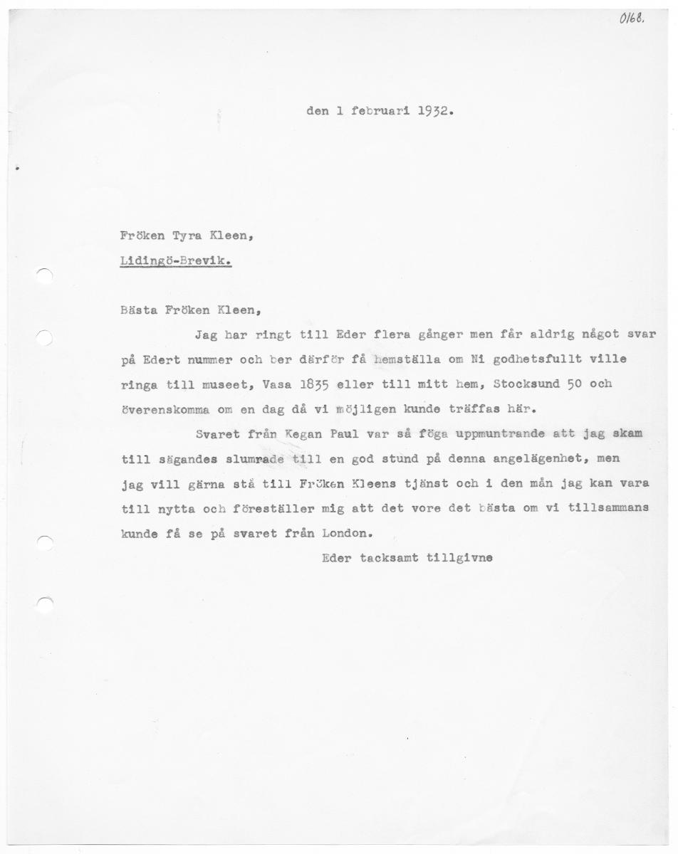 0/68, den 1 februari 1932. Fröken Tyra Kleen, Lidingö-Brevik. Bästa Fröken Kleen, Jag har ringt till Eder flera gånger men får aldrig något svar på Edert nummer och ber därför få hemställa om Ni godhetsfullt ville ringa till museet, Vasa 1835 eller till mitt hem, Stocksund 50 och överenskomma om en dag då vi möjligen kunde träffas här. Svaret från Kegan Paul var så föga uppmuntrande att jag skam till sägandes slumrade till en god stund på denna angelägenhet, men jag vill gärna stå till Fröken Xleens tjänst och i den mån jag kan vara till nytta och föreställer mig att det vore det tästa om vi tillsammans kunde få se på svaret från London. Eder tacksamt tillgivne