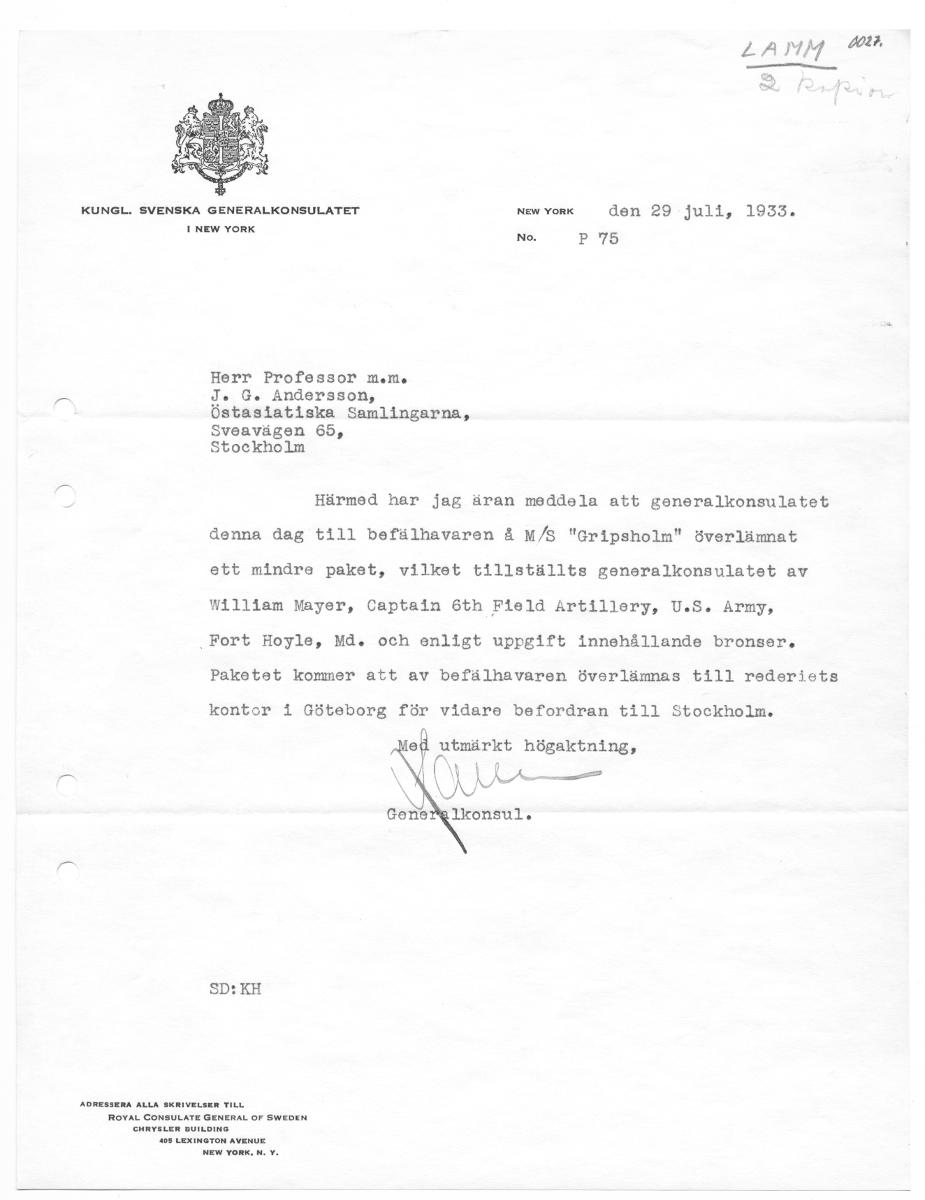 ZA MM VARA pe er CA p ry KUNGL. SVENSKA GENERALKONSULATET NEW YORK den 29 juli, 1933. I NEW YORK NÖ. P 75 Herr Professor mem. Je GÅ Andersson, Östasiatiska Samlingarna, Sveavägen 65, Stockholm Härmed har jag äran meddela att generalkonsulatet denna dag till befälhavaren å M/S "Gripsholm" överlämnat ett mindre paket, vilket tillställts generalkonsulatet av William Mayer, Captain 6th Field Artillery...