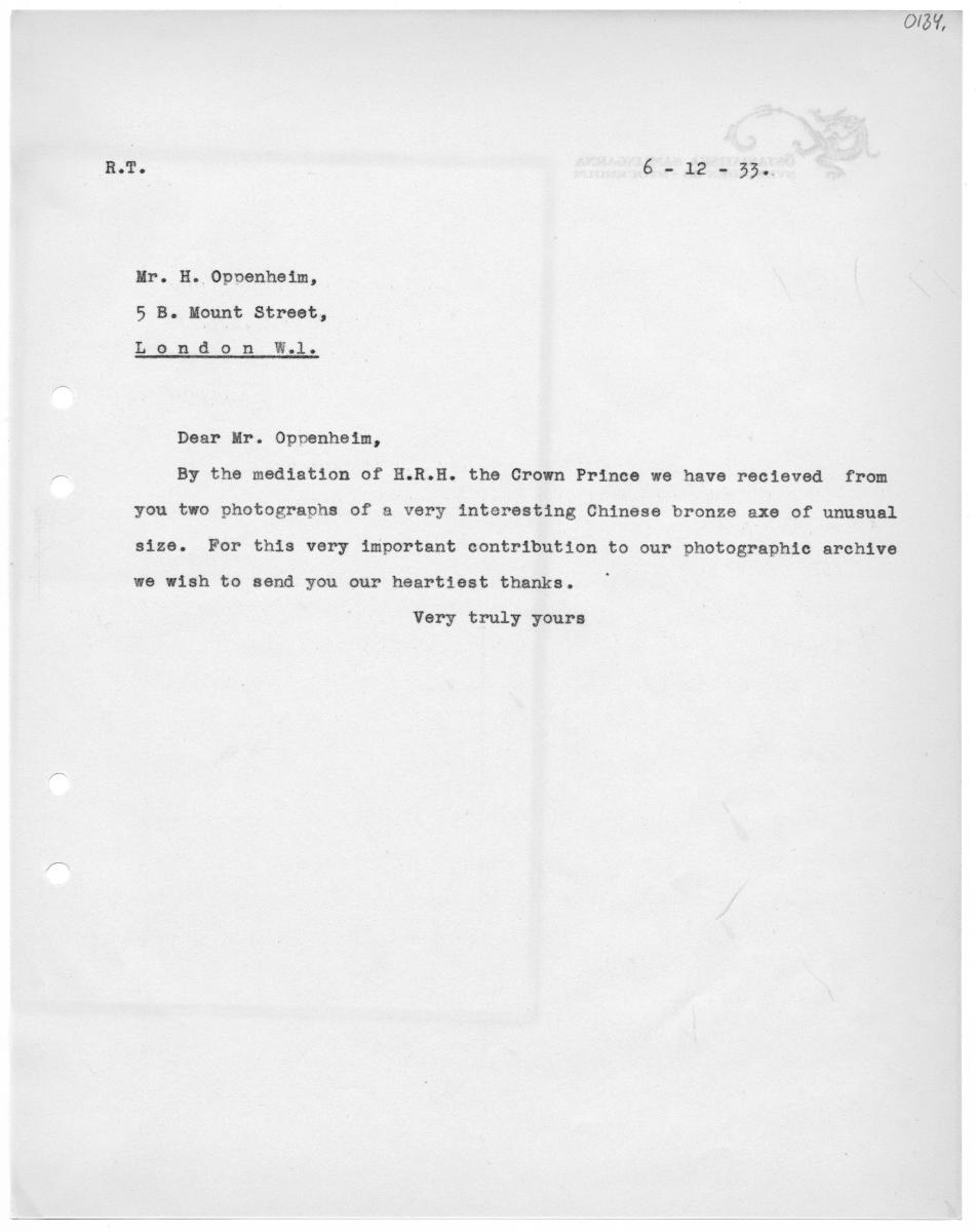 03 q R.T. 6 - 12 - 33. Mr. H. Opovenheim, 5 B. Mount Street, Lönd on Wl. Dear Mr. Opvpenheim, By the mediation of H.R.H. the Crown Prince we have recieved from you two photographs of a very interesting Chinese bronze axe of unusual size. For this very important contribution to our photographic archive we wish to send you our heartiest thanks. Very truly yours