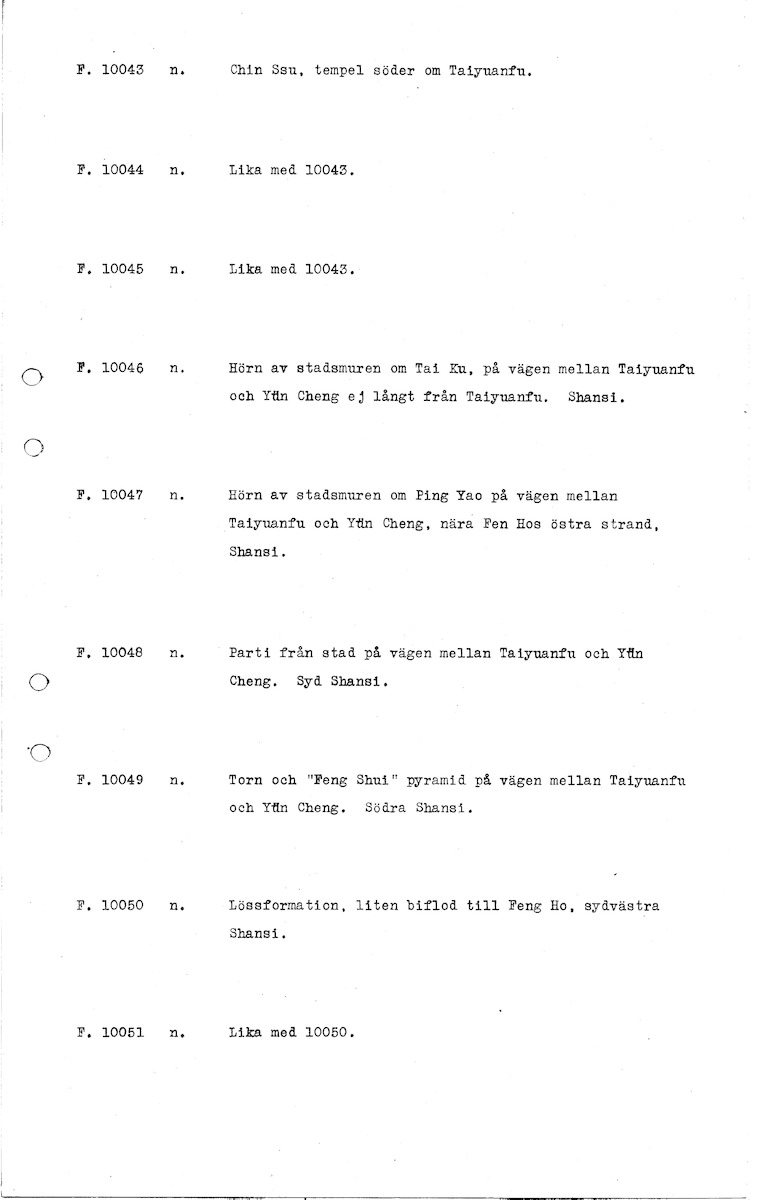 • Sida ur katalog för fotografier av Johan Gunnar Andersson, F.10000-10576, 11000-12233, 50000-50044.
