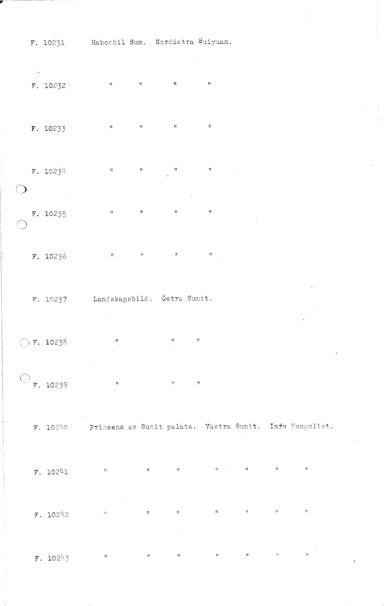 • Sida ur katalog för fotografier av Johan Gunnar Andersson, F.10000-10576, 11000-12233, 50000-50044.