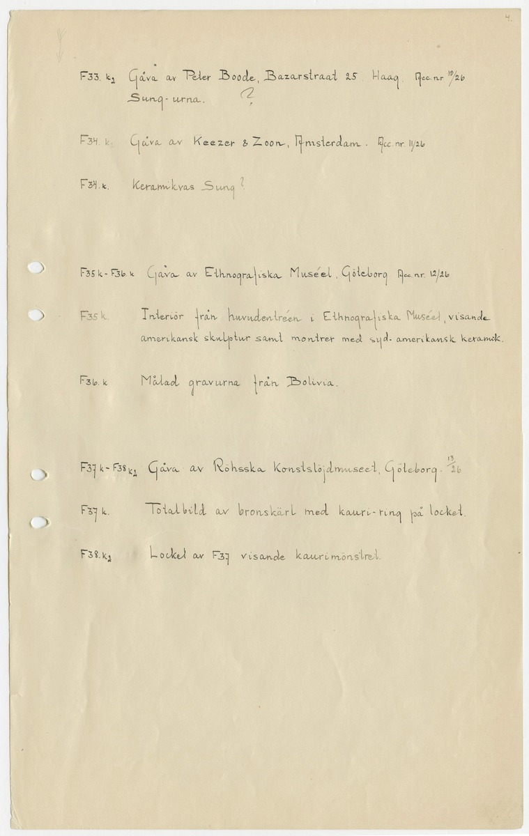 • Sida ur katalog för fotografier, "Presentfotografier" från Johan Gunnar Andersson, F.0001-1999, 20000-.