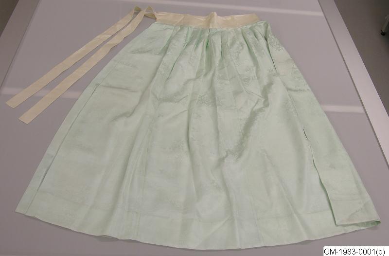 This unlined skirt is made from light green silk fabric and has a white waistband with long strips. The seems are hand-stitched. The green fabric has a weave pattern of flower bouquets and interlinked swastika symbols. This kind of skirts, called chima in Korean, comprise a part of a woman's traditional Korean dress, hanbok. A chima was tied above multiple layers of undergarments, such as under-trousers (see OM-1983-0001c) and underskirts to give the skirt a full, voluminous appearance. Chima were worn in combination with a traditional jacket (Korean: jeogori). Traditional hanbok are still worn in in Korea today during special occasions.