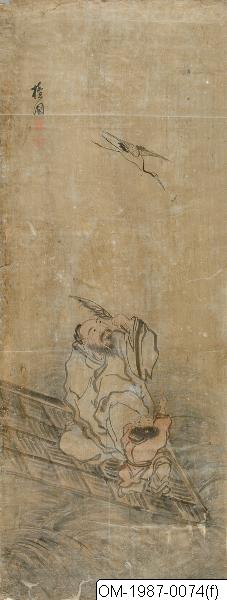 Older man, possibly representing the Tang dynasty poet Jang Ji-hwa (Chinese: Zhang Zhihe) with a boy sitting on a mat on the water. The old man holds a feather in his hand. Both look up toward the sky where a crane is flying. A symbol of longevity, the crane often appears in paintings with immortals).