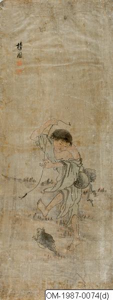 The immortal Yu Hae-seom (Chinese: Liu Haichan) playing with a three-legged toad. He has a Hulu (calabash bottle) tied around the waist. Imagery of Yu Hae-seom and the toad symbolise wealth. This painting is part of a series of six paintings rendered in ink and colour on paper each depicting another immortal. In Korea, the immortals existed as individual subject for painting since the Goryeo period and were frequently depicted by professional painters and in folk paintings during the mid and late Joseon period. Immortal paintings of the Joseon period show individual immortals, such as the God of Longevity, sometimes accompanied by one or two boy attendants, or groups of immortals, such as The Eight Immortals. Each immortal has a distinct iconography that is related to the immortal's individual hagiography. The immortals usually appear in paintings alongside a variety of symbols and attributes. Of the six immortals depicted in this series of paintings, only one, Yu Hae-seom (Liu Haichan), can be identified (refer to OM-1987-0074 (D)). The other five figures share many characteristics with well-known immortals, however, they cannot be securely identified. Immortal paintings were appreciated for their symbolic meaning, the wish for a long, healthy and happy life, and, for this reason, were sometimes commissioned as presents for 60th birthdays. All six paintings in this series were patched in the back and have folding marks. Some paintings have marks of pins used to attach it to the wall. Remnants of characters, written onto the paper or from re-used paper patches, can be seen on the back of some of the paintings. Each painting is signed "Danwon" (檀園) and sealed "Saneung" (士能). Danwon and Saneung are the sobriquets of Kim Hong-do (김홍도 金弘道; 1745–1806?).
