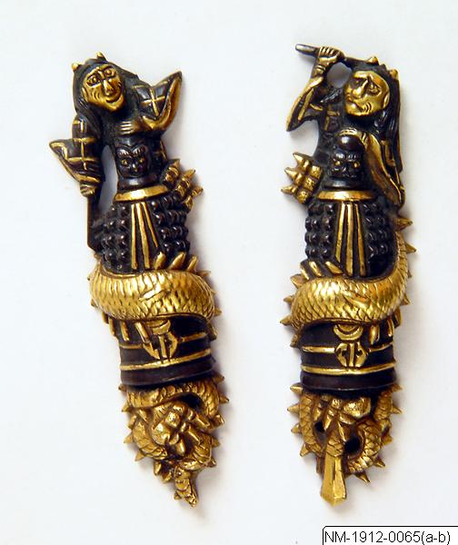 Menuki (kavelbeslag) av metall. Enligt katalogkort: "Kavelbeslag, Menuki ett par av brons med guld i form av stående mytologiska figurer, omslingrade av drakar. Ciselerat arbete.” Bredd 1,6 cm, längd 5,3 cm. (Bearbetad då A-B-märkning togs bort ur accessionsnummerfältet/CR.)