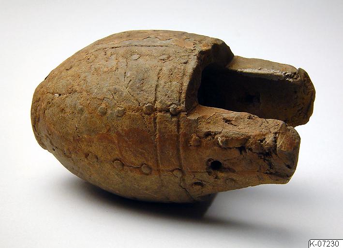 Kärl av keramik, från Kina. Kärlet har rund botten och kan ej stå självständigt. Det har två hänklar med hål igenom som indikerar att kärlet är avsett för upphängning.