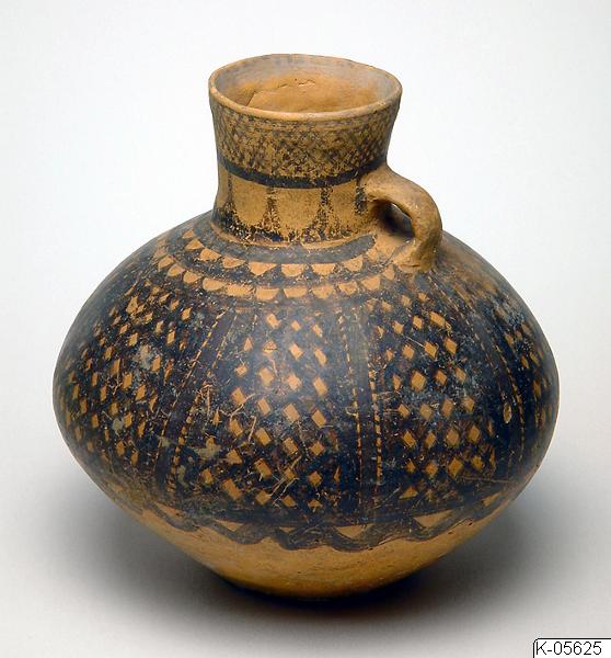 Kruka av målad keramik, från Kina. Krukan är målad med mönster i svart och brunviolett. På undersidan finns påskriften “Ning Ting Hsien Pan Shan Bought” Invid föremålsmärkningen finns också bokstaven “B” inskriven i en fyrkant.