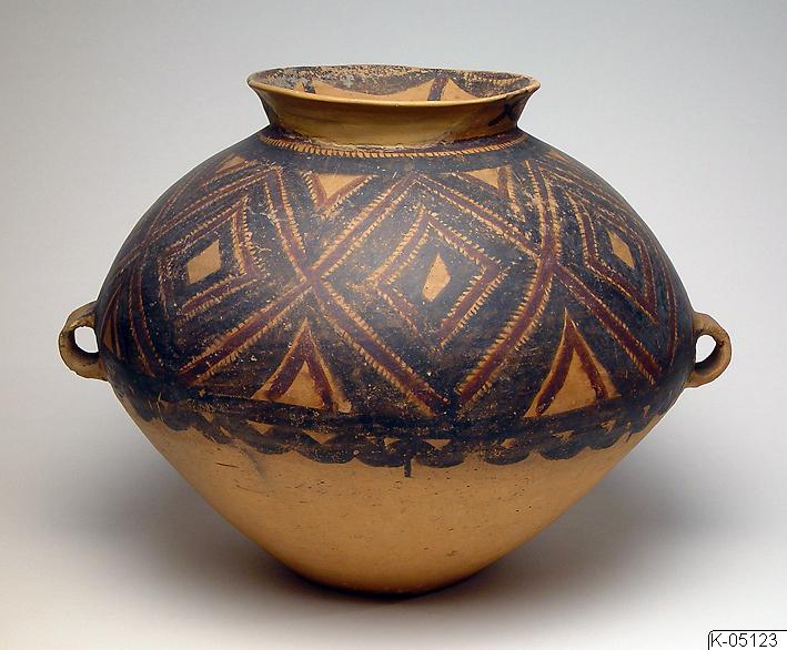 Kruka av målad keramik, från Kina. Krukan är målad med mönster i svart och violett. På undersidan finns påskriften “Bought in Lanchow”. Invid föremålsmärkningen finns också bokstaven “S” inskriven i en fyrkant.