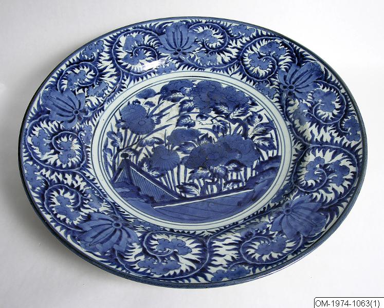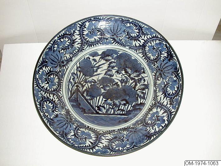 Enligt katalogkort: Fat, stort. Dekor i underglasyrblått.Tillverkningsort: Jingdezhen.