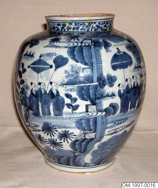 Urna av porslin med dekor av figurer i trädgårdslandskap i underglasyrblått. Kring halsen ranka. Arita-vara.