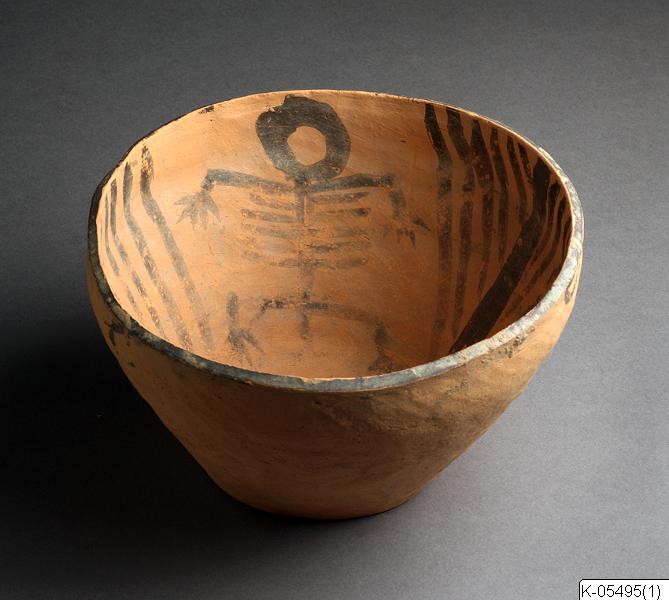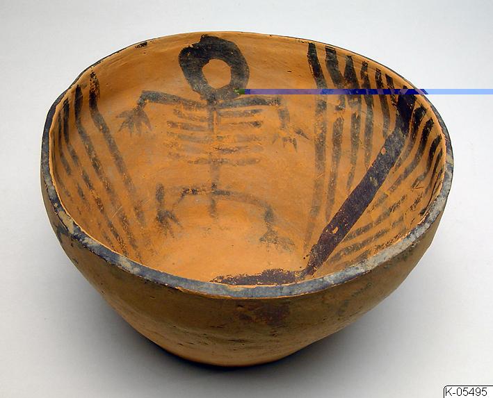 • Skål av målad keramik, från Kina. Skålen är målad med mönster i svart, bland annat föreställande ett människoskelett. På undersidan finns påskriften “Ning Ting Hsien Wa Kuan Tsui Bought”. Invid föremålsmärkningen finns också bokstaven “S” inskriven i en fyrkant.
