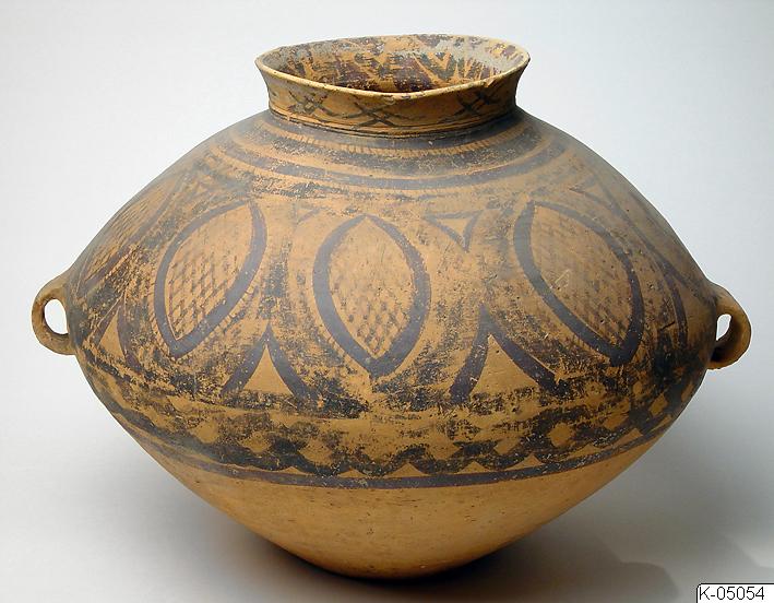 • Kruka av målad keramik, från Kina. Krukan är målad med mönster i svart och violett. På undersidan finns påskriften “Bought in Lanchow”. Invid föremålsmärkningen finns också bokstaven “S” inskriven i en fyrkant.