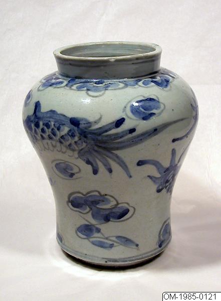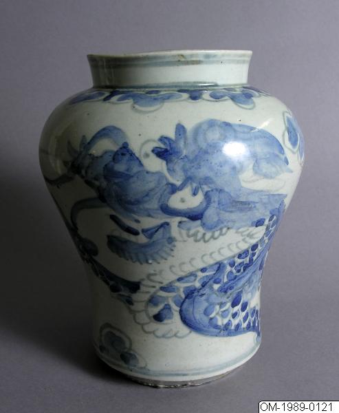 Den är porslinskrukan har en vid mynning och en något utsvängd hals. De utstående skuldrorna smalnar av och går ner till en smal midja och en diagonalt skuren, indragen fot. En blå dubbel linje går runt kärlets mynning och en enkel blå linje går runt kärlet mellan hals och skuldror. En bård med yeouidu (molnformade lyckobringande symboler) går som en krage nedanför halsen och ett motiv med en fant...