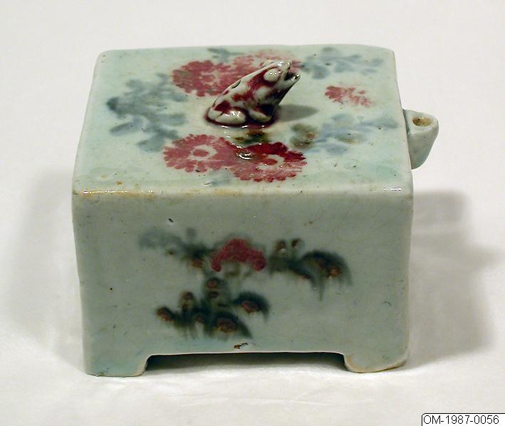 Fyrkantig vattendroppare. Porslin med målad dekor i kopparrött och underglasyrblått. På översidan liten, skulpterad groda täckt av röd glasyr., Fyrkantig vattendroppare i porslin m liten röd groda på....
