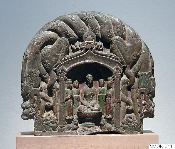 Toppen av en buddhistisk votiv stela.Det bekrönade huvudmotivet utgörs av tre par ormliknande drakar, vilkas kroppar flätats parvis i varandra. Under dem bildas på vardera sidan en nisch i vilken buddhistiska figurer är placerade. På framsidan ses en Buddha sittande på lotustronen, åtföljd av två Bodhisattvor och två munkar, samt vaktad av två lejon. Norra Chi perioden; (550-577) Grå kalksten med spår av färg.