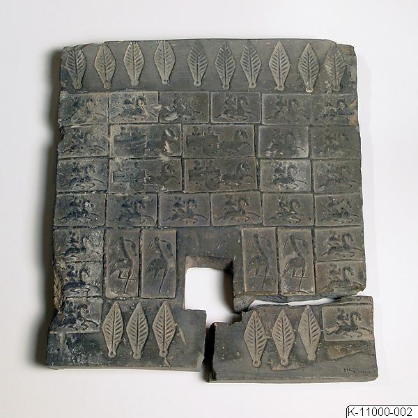 Väggreliefen är i två delar, då en mindre del har gått av. Den är dekorerad med fält med dekor i upphöjd relief föreställande ryttare till häst, hästdragna vagnar och fåglar. Bladbårde...