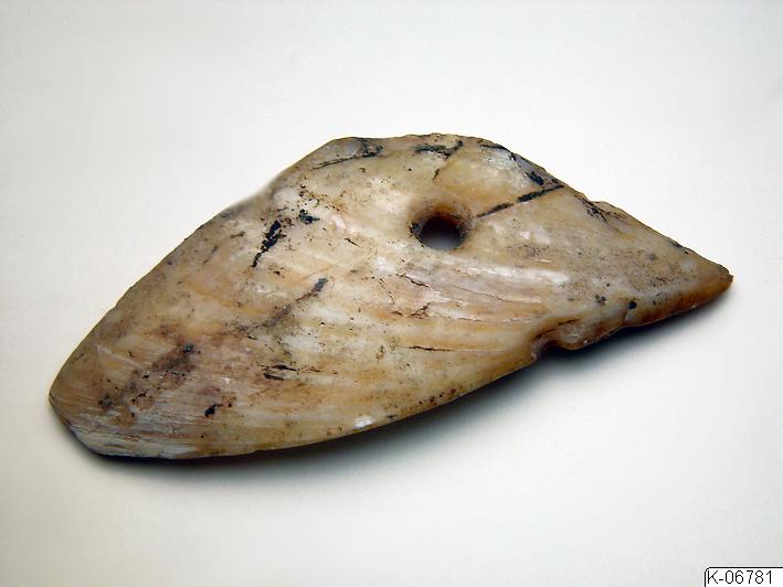 Pärlemorbiten har ett genomgående hål och invid föremålsmärkningen finns påskriften “Y.S.”.Längd 8,5 cm, bredd 4,2 cm.