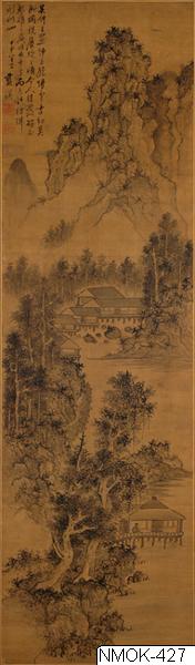 Motiv: Höga berg och byggnader vid en flod efter Wu Zhen.Signerad och daterad.Målning i tusch och färger på siden. Vertikalmålning.