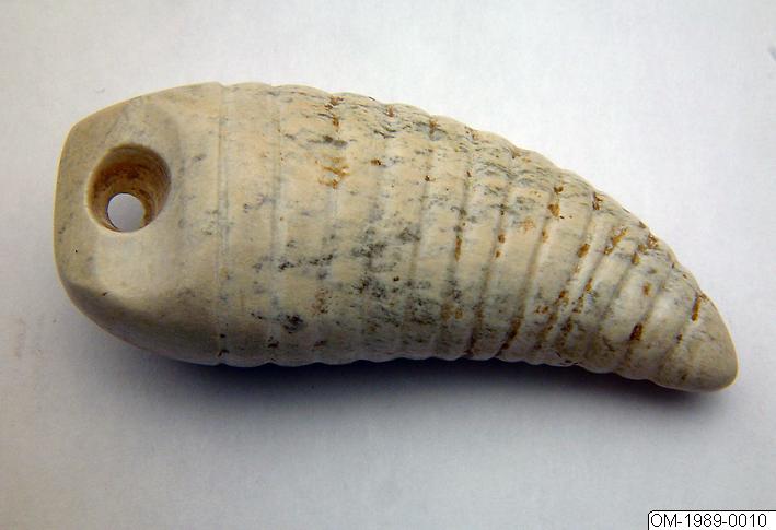 Hängsmycke i form av silkesmask. Räfflad kropp. Hål för upphängning överst. Vit, kalcifierad jade.