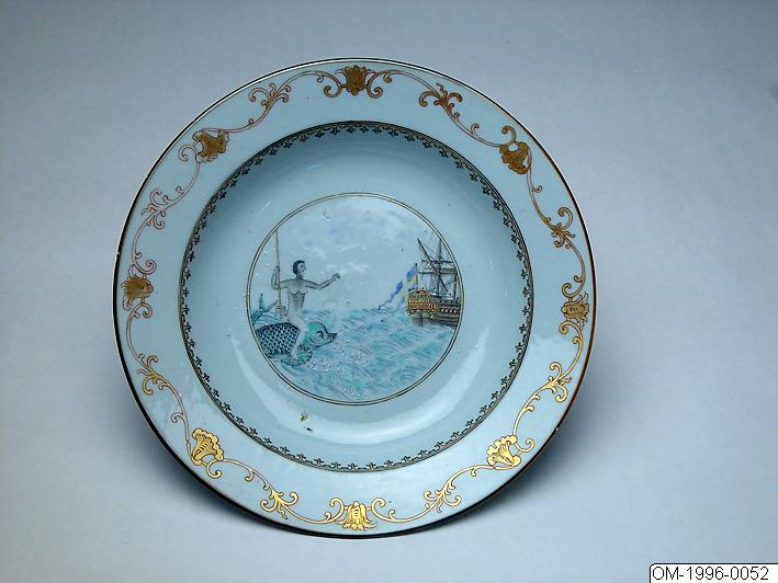 Tallrik av porslin. Djup med utvikt brätte. Dekor i emaljfärger i järnrött, blått, gult, turkos och svart samt guld. I spegeln rund medaljong som visar Neptunus (Poseidon) med sin treudd i handen ridande på en delfin över ett upprört hav, där solen just går ned i bakgrunden, och en ostindiefarare med svensk flagg just försvinner bort till höger i bilden. I kepen fleur de lis bård och på brättet rokokobård med blad och musselskal. Denna scen, som ursprungligen måste gå tillbaka på en europeisk förlaga, var mycket omtyckt vid 1700-talets mitt och användes av de kinesiska porslinshandlarna för kunder från olika länder, som kunde få sitt eget lands flagga inmålad på skeppet. Förutom den svenska flaggan är dansk och holländsk flagg ofta förekommande. Tallrikarna finns med olika slags bårder. Tallrikar av detta slag måste ha varit den perfekta souveniren för skeppens besättningar.