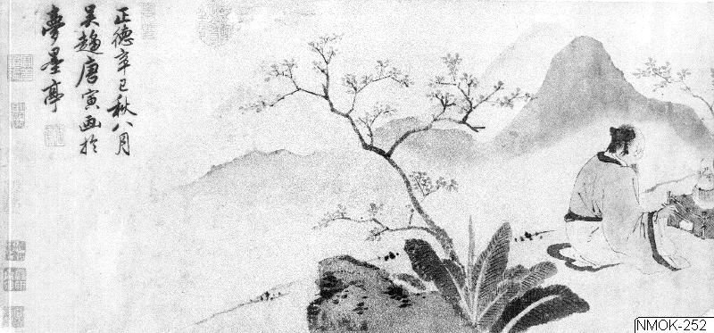 Signerad: Zhengde (perioden) Xinsi (året), 8:e månaden på hösten (oktober 1521), målad av Tang Yin från Wuchu i Tuschdrömmarnas paviljong, Se även under Övrigt,