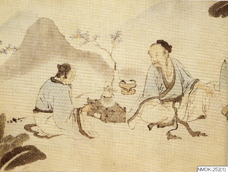 "Tedrickning." Två män sitter på en öppen terass. Mellan dem en liten eldstad, på vilken vattnet kokar. Den ene av dem är sysselsatt med att bereda teet, den andre har tagit med sig några böcker och skriftrullar. Platsen är dekorerad med en blommande kvist i en vas och omgiven av trädgårdsklippor samt bambustånd ochett bananträd. Bleka bergskonturer i bakgrunden. Kort horisontalrulle. Tusch och färger på papper.