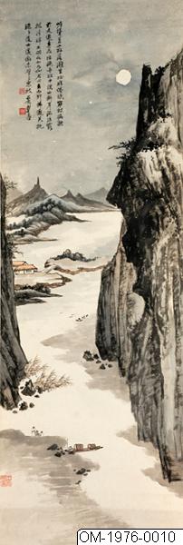 Inskription av konstnären: “Månen gick upp över den höga klippan, vattenståndet var lågt och sandbanken växte. De trötta gässen sov, och i den kalla byn läckte vattenuret. Jag bjöd mina vänner gå ombord på en fiskebåt. Vi seglade till kanalens mitt, och stannade vid den branta klippan. Den kalla daggen droppade ned, månskenet omslöt oss. Vi kände oss som odödliga, våra hjärtan var orubbliga som Buddha, vi var som skrattande daoistmunkar, stoltare än Su Dongbo vid den Röda Klippan”.