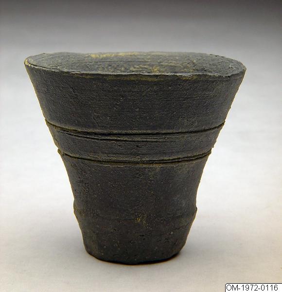 Den här konformade koppen är ovanligt liten och har en vid mynning och sidor som smalnar av i en nästan helt rak linje mot en smal bas. Två inristade linjer ringar in koppens mittsektion och ett upphöjt band går runt koppens nedre del. Basen är platt och har spår av ljusgrå sand. Snurrmärken tyder på att drejskiva använts för att jämna ut ytan. På insidan av koppen syns keramikerna fingeravtryck på sina ställen. Krukan är mörkgrå. En liknande men större kopp finns i samma samling (se OM-1972-0115). Kopparnas speciella form kan ha inspirerats av små glaskoppar som tillverkades i Silla runt 400-talet.