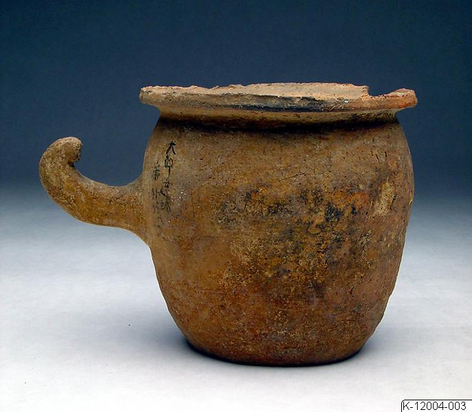 This cup has an everted, thick rim; the sides swell slightly around the shoulders and taper down to the flat base in a curve. On one side, a handle protrudes from the body. The end of the handle is broken off, but it can be inferred that it originally had a curled shape. From the horizontal dents along the body and the irregularity of the shape, it can be implied that the vessel was formed by coiling. The outer surface was probably smoothened with hands or a wooden paddle. The vessel has fired at a low temperature (between 1000 and 1200 degrees Celsius) and oxidised to a reddish colour. The clay is coarse, containing sand particles. Sand was often used for tempering the clay of earthenware vessels to avoid rapid expansion or contraction of the vessel during firing which could result in cracks. On the right side of the handle, an inscription in black ink(大邱 達城 番外 I 墳) was written onto the body indicating the find spot of the vessel near Daegu, Dalseong district. The word "Korea" in Roman alphabet was inscribed onto the base. This vessel was used as a burial object and probably held foodstuffs for the deceased or served as an urn.