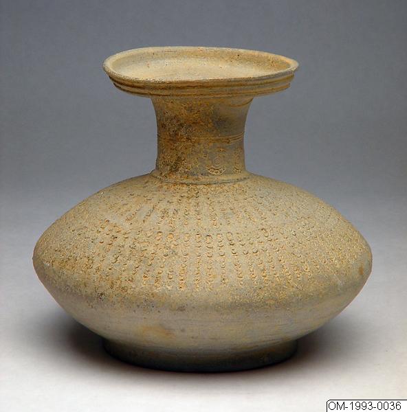 Korea. Silla, 700-800-tal. Flaskformad vas av grått stengods med stämpeldekor kring skuldran, Silla, 700-800-talet. Gåva av Bengt Julin