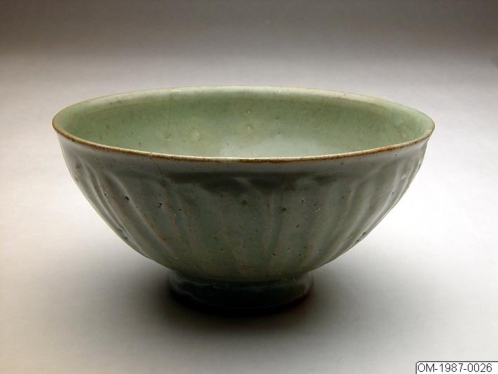 Skål med skuren blomdekor på utsidan. Stengods med tjock, grågrön celadonglasyr. Sned fotring., Skål, stengods, celadonglasyr. Korea. Koryo. A. Kalbaks samling (inköp) Skålen har gått sönder och lagats., Lagad.