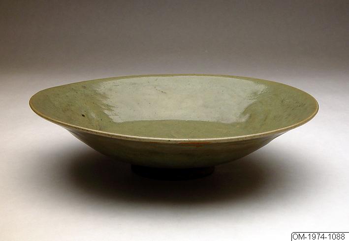 Fat av keramik glaserat med celadonglasyr. På insidan svaga blommönster. Från monter 37. Höjd 5 cm, diam. 19,5 cm. Hobson 1921: Song eller Yuan. Från nordl. Kina P.David 1959: Nordlig celadon, Södra Song, eller Yuan.