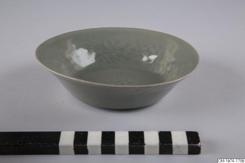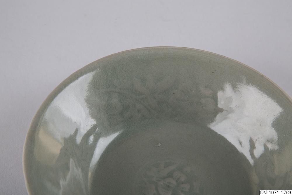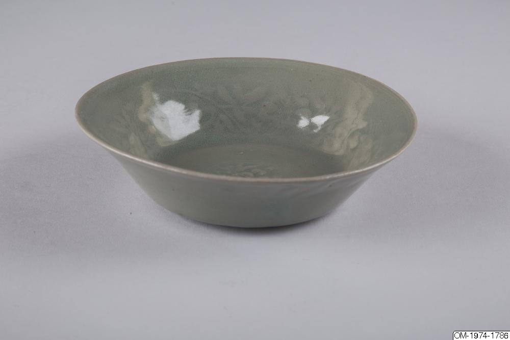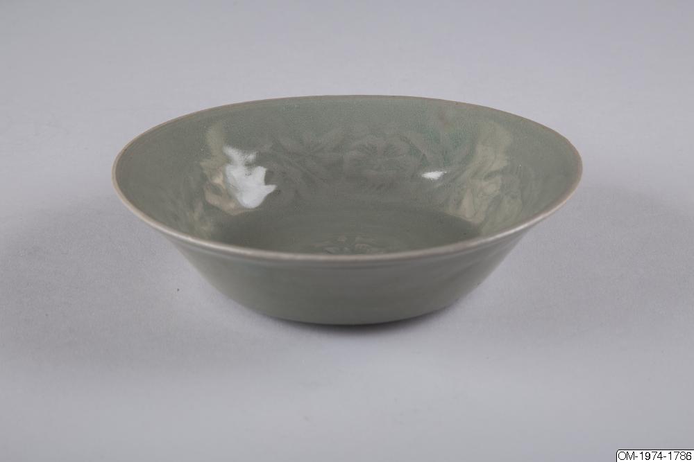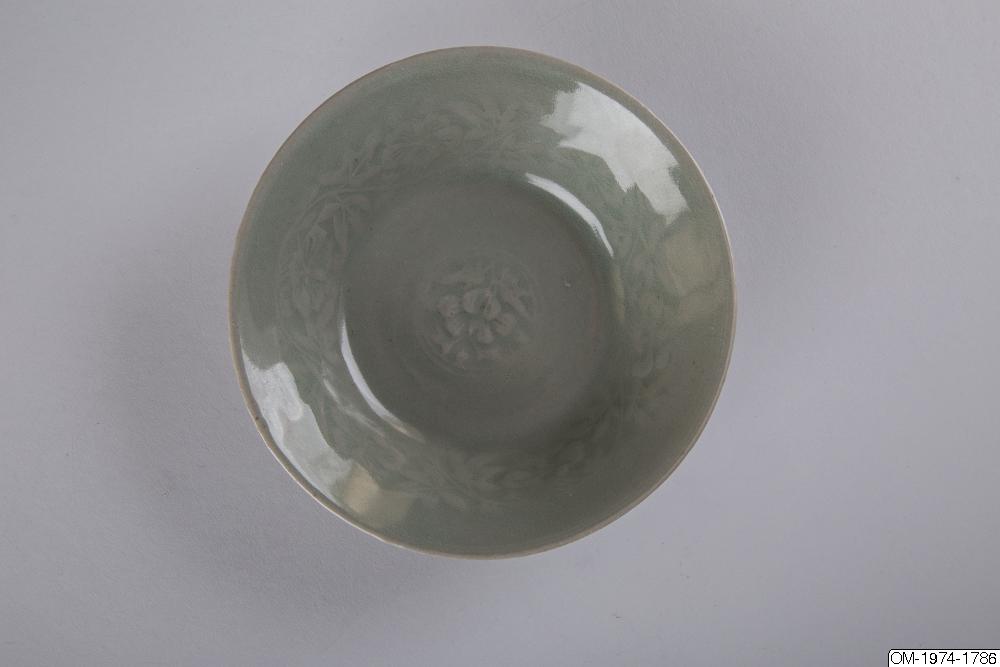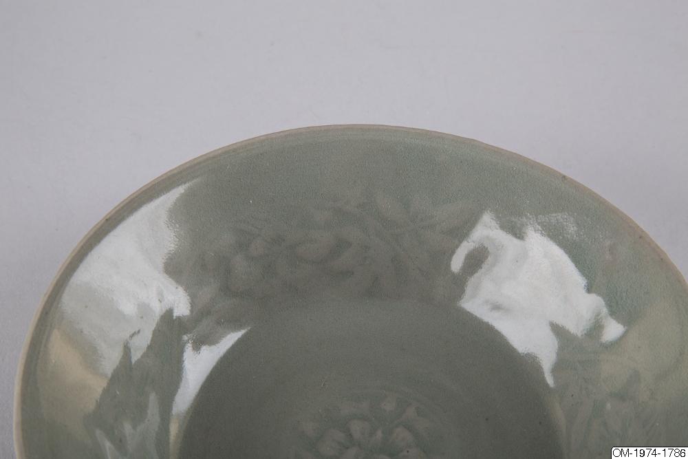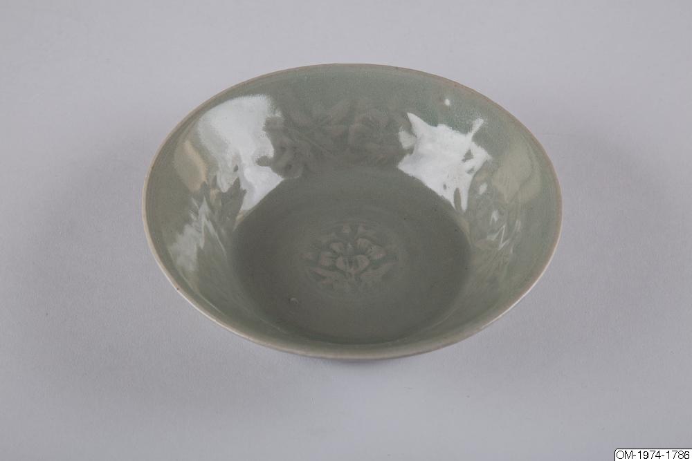 Enligt katalogkort: “Skål i öppen klockform. Invändigt blomrankor i låg relief. Stengods med blågrön celadonglasyr. Diam 140 mm. h. 38 mm. Korea. Koryo.” Från monter 37. Höjd 4 cm, diam. 14 cm. obild