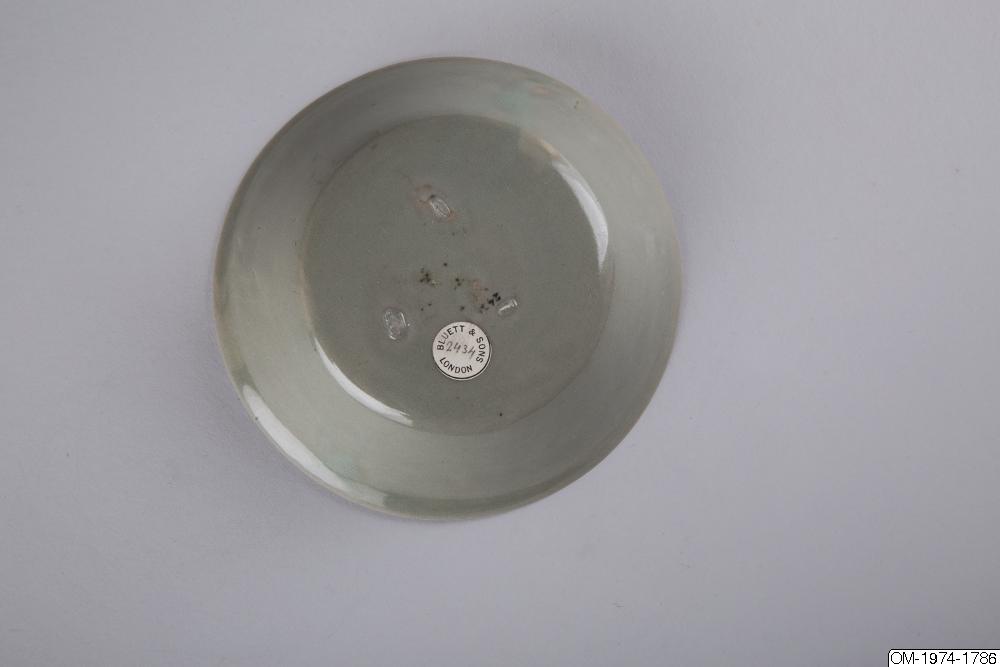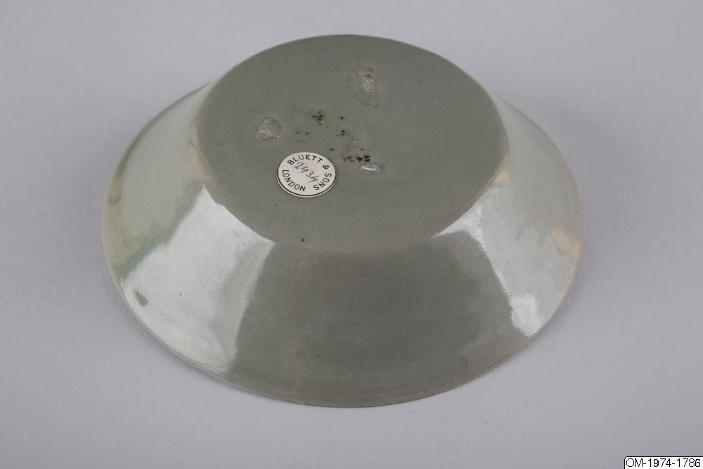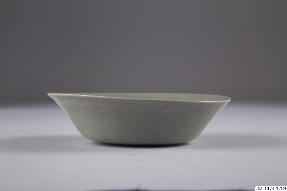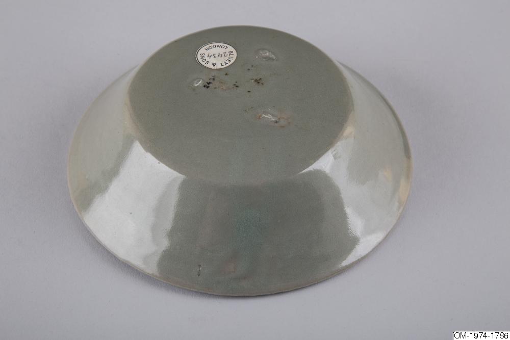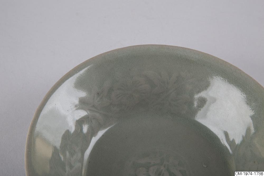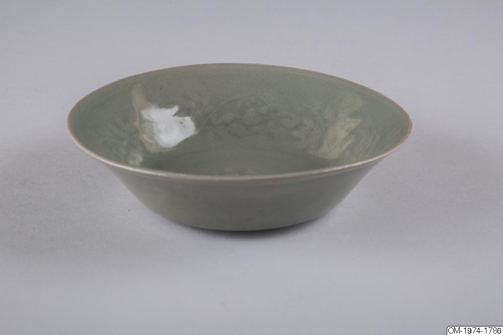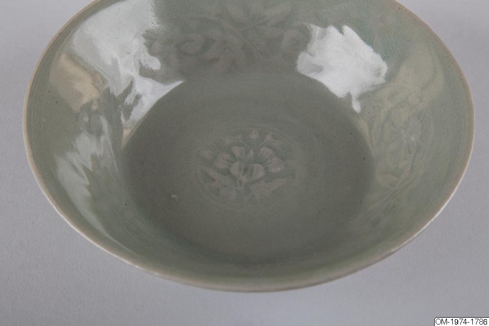 Enligt katalogkort: “Skål i öppen klockform. Invändigt blomrankor i låg relief. Stengods med blågrön celadonglasyr. Diam 140 mm. h. 38 mm. Korea. Koryo.” Från monter 37. Höjd 4 cm, diam. 14 cm. obild