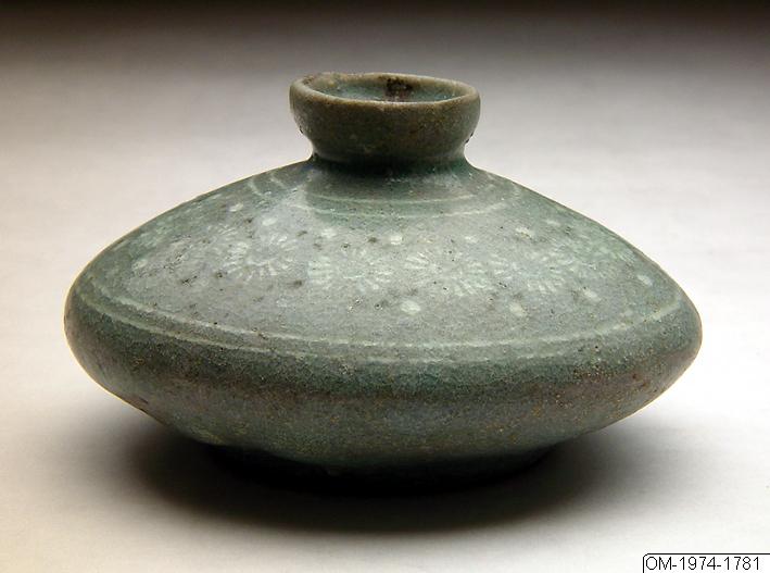 This oil bottle has a dish-shaped mouth with a narrow opening, sloping wide shoulders and a globular, squashed body. The mouthrim is worn from the use of a stopper, which is now missing. A wide register with densely aligned chrysanthemum flower motifs inlaid in black and white (Korean: sanggam) encircles the shoulders and is closed off by a double-ring below the mouth and another double-ring at the edge of the belly. The object is coated with a greenish-tinged, crackled glaze. The glazed base is indented at the center and the footrim bears the scars from three silica chips which served as supports during firing. Sanggam literally means image (sang) and intaglio or inlay (gam), the inlaying of one material into another. In the case of celadon wares, the sanggam technique involves the process of carving and impressing decorative motifs onto the drying clay and then filling in the shapes with white slip or red ocher clay (fires to black). After glazing and firing, the white and black slip areas would stand out from the body material and create a vivid decorative effect. Sanggam as a decoration technique for celadon wares developed and proliferated in the 12th and 13th century during the Goryeo dynasty (918-1932) and is a unique and representative craft of Goryeo arts. In the Goryeo period (918-1392), small bottles like the one described above held fragrant cosmetic oils that were usually applied to the hair or the body.