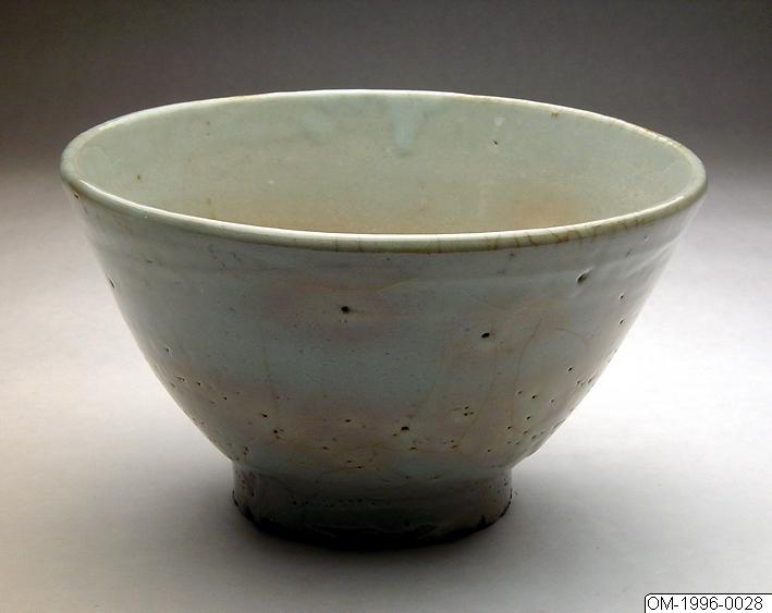 • Den här nästan konformade skålen har raka sidor som svänger in i en lätt böj på den nedre halvan. Den vilar på en ganska hög fot med med djupt karvad bas och lutar åt ena sidan. Glasyren är ojämn och skålen har en gråaktig ganska mörk ton. På insidan syns märken efter åtta stycken bränningsstöd i lera runt botten vilket tyder på att den bränts i stapel. På utsidans nedre del ar glasyren skurit sig... Visa hela