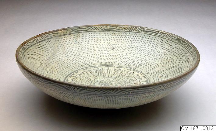 Enligt Statens konstsamlingars tillväxt och förvaltning 1971: “Skål av stengods med sanggam-dekor. Koryo. Gåva av direktör Werner Schmidt.” Från monter 36. Höjd 6 cm, diam. 20 cm.